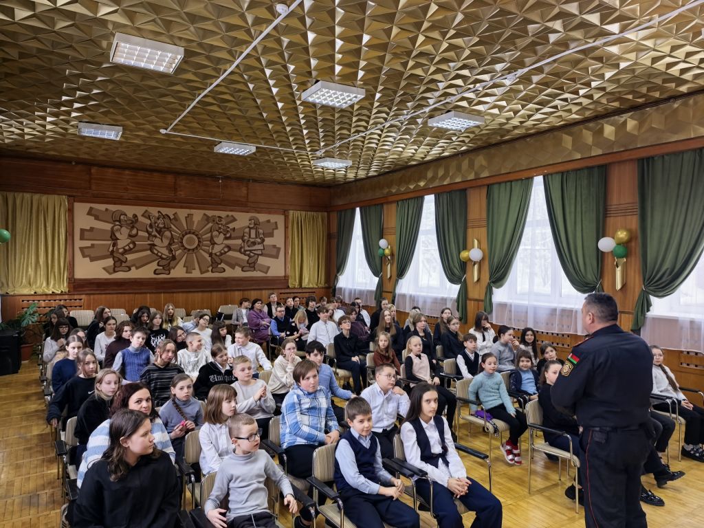14.01.2026Сегодня в нашем учреждении образования прошла встреча с старшим инспектором ИДН Ленинсаого РУВД города Могилева майором милиции Колесневым Владимиром Михайловичем, который напомнил ребятам о правилах проведения в стенах школы и на ее территории. Вспомнили о правилах безопасности вблизи водоемов и при катании на тюбингах. Владимир Михайлович рассказал статистику по правонарушениям за период зимних каникул. В завершении встречи он пожелал всем нашим ребятам успехов в лечении и учебе, ведь впереди самая длинная четверть этого учебного года.